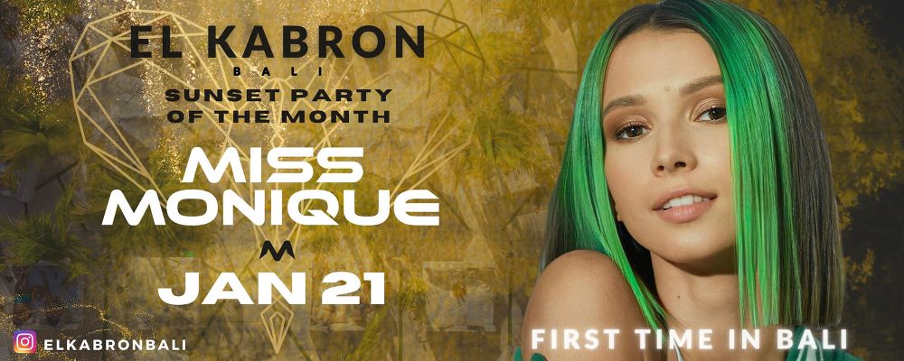 DJ asal Ukraina, Miss Monique akan tampil untuk pertama kalinya di Bali dalam acara spesial Miss Monique: El Kabron Sunset Party pada 21 Januari 2023 mulai pukul 15 hingga selesai. Miss Monique merupakan salah satu DJ musik Progressive House yang tengah naik serta menjadi DJ wanita yang paling populer untuk aliran tersebut.
