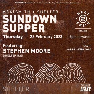 Pada 23 Februari 2023, jangan lewatkan program makan malam spesial di Meatsmith Indonesia. Restoran barbeku tersebut akan menggelar ajang kolaborasi Shelter Bali x Ageless Galaxy bersama Chef Stephen More. Sesi makan malam set menu ini akan dimulai dari pukul 18 dengan harga Rp900.000++ per orang. Tersedia hiburan live music untuk menyemarakkan malam.