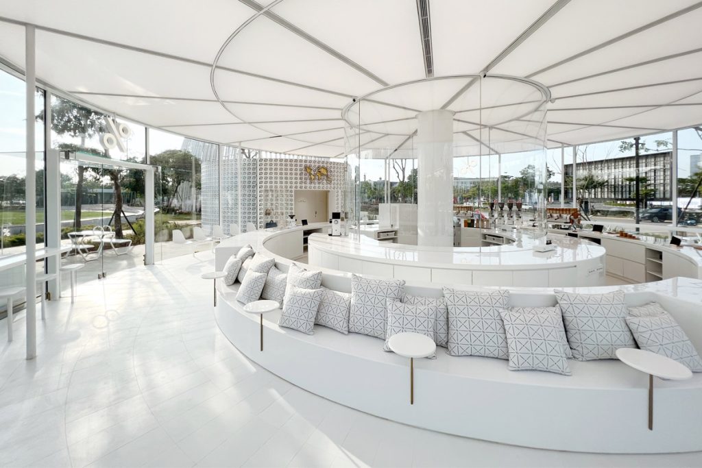 Untuk % Arabica Jakarta PIK Drive Thru, desainer kondang Shohei Suzuki dari Nomura no.10 menciptakan sebuah desain yang mengedepankan nilai estetika yang halus dan bersih dengan warna putih yang dominan. Dengan luas 398 meter persegi, gerai ini menawarkan ruang duduk di dalam dan luar ruangan yang masing-masing berkapasitas 50 dan 56 orang. “Desainnya yang membulat juga menghadirkan garis pandang yang jelas, sehingga tamu dapat menikmati pemandangan lanskap hijau secara 360 derajat,” tutur Shohei.