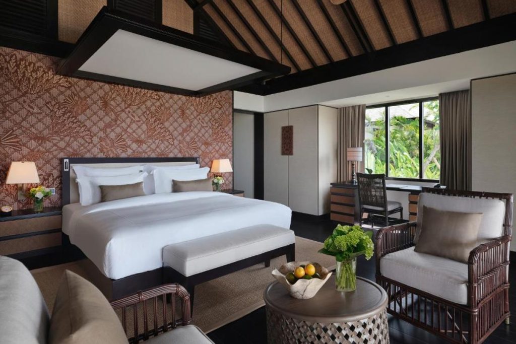 Desain vila masih selaras dengan desain lobi, di mana material kayu mendominasi ruangan berkelindan dengan furnitur berbahan kayu dan rotan yang ditata apik. Sebuah tempat tidur bergaya simpel ditata di depan sebidang dinding berlapiskan motif batik dari Hadiprana Gallery. Sentuhan tradisional melebur serasi dengan nuansa modern.