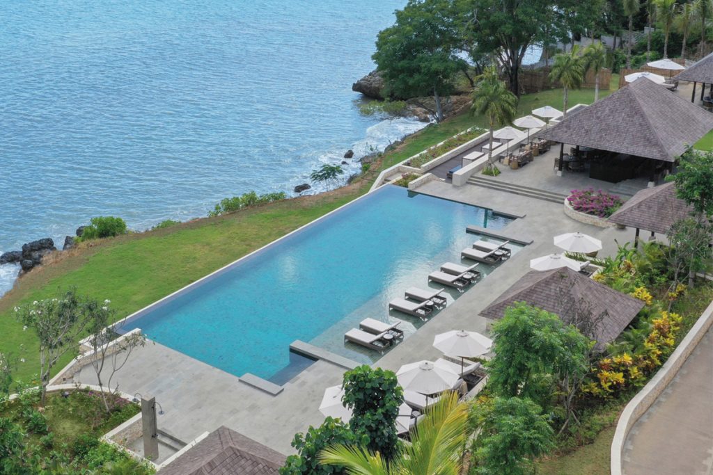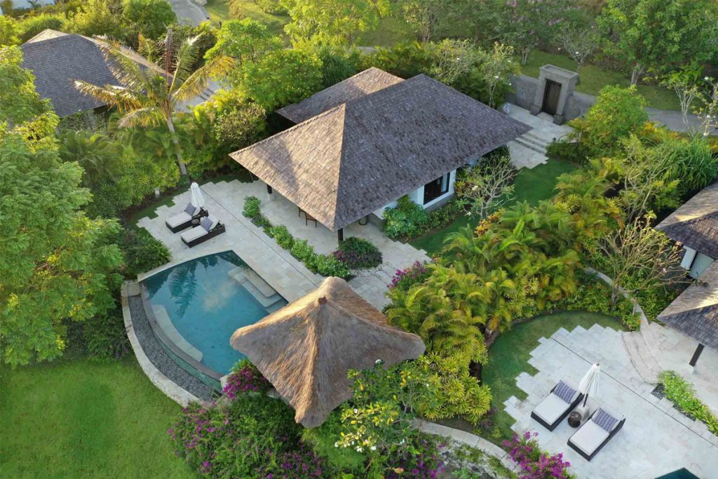 Raffles Bali bersarang di kawasan Jimbaran, area teluk populer di Bali yang dihuni oleh hotel-hotel mewah mulai dari InterContinental Bali Resort, Ayana, hingga Four Seasons. Resor luks ini berdiri gagah di atas lahan seluas 23 hektare dan menaungi 32 vila dengan luas mulai dari 375 meter persegi lengkap dengan kolam privat. Desain resor ditangani oleh Grounds Kent Arsitek Indonesia, firma desain yang juga pernah menggarap properti kakap di Bali, seperti Four Seasons Resort Jimbaran dan St. Regis Bali. Sedangkan lanskapnya yang asri, dikerjakan secara gotong royong oleh James Hyatt Studio, Made Wijaya, dan Rama Wijaya International Design.