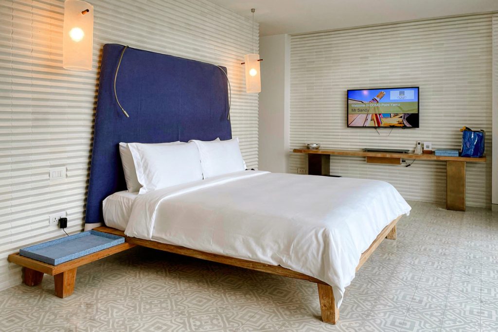 Resor yang dibuka pada 2013 ini menaungi 106 akomodasi yang dipecah menjadi beberapa kategori, yakni kamar, suite, dan vila privat dengan satu hingga empat kamar tidur. Beberapa opsi akomodasinya dicetak menghadap Laut Andaman, menyajikan vista elok dari jendela berukuran raksasa. COMO Point Yamu cukup royal dengan ukuran kamar-kamarnya. Akomodasi tipe terendah, Bay Room, memiliki luas mulai dari 40 meter persegi. Ketika itu, saya menginap di kamar tipe Bay Suite yang dilengkapi dengan ruang duduk terpisah dan balkon privat. Interiornya didominasi warna biru dan putih dengan perabotan kayu bergaya simpel.
